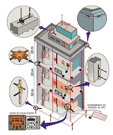 - Método Gaiola de Faraday: o método por malha de proteção é baseado no envolvimento da edificação por um conjunto de capturadores e cabos aterrados de descida, todos espalhados pela estrutura. Esse método tem uso mais comum em estruturas de grande porte, como prédios planos, barracões e galpões.